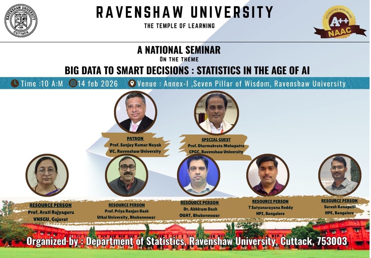 The Statistics department shares the vision of the institute of achieving excellence in teaching and research. The department was established in 1974. It has always striven to succeed in this endeavour. Over the years, it has evolved as one of the premier departments in the country providing excellent teaching and research in Statistics. In addition, research is also carried out in interdisciplinary areas of science and technology thereby contributing to the vibrant academic ambiance of Ravenshaw University, Cuttack. The department runs B.A./B.Sc. (Statistics Honours), B.A./B.Sc. B.Ed. (Statistics Honours), M.A./M.Sc., M. Phil. and Ph.D. Programmes. The current faculty (with a dedication to teaching, complement one another with diversified research interests in fields like operation research, inventory management, queuing theory, inference, sampling, Probability and Reliability Theory). The current faculty’s qualitative publications are a milestone in research that enhances the scope for further research in the department. The department has a well-versed curriculum framed according to the U.G.C. guidelines. Every year, students are selected to participate in summer internship and training programmes like MTTS, TPM, etc. to enrich their knowledge and problem-solving skills in the subject. Our students also qualify for tests like GATE, CSIR-UGC (NET) and are admitted into reputed National research institutes like NISER, IISER, IITs, NITs, ISM Dhanbad, etc. They also succeed in getting good job opportunities in the state and national levels, respectively. Established in 1974 as a part of Ravenshaw College and from 2006 as a regular department of Ravenshaw University, Department of Statistics has sanctioned teaching position of seven. The Department offers B.A. and B.Sc. in Statistics Honours, and M.Sc. in Statistics.